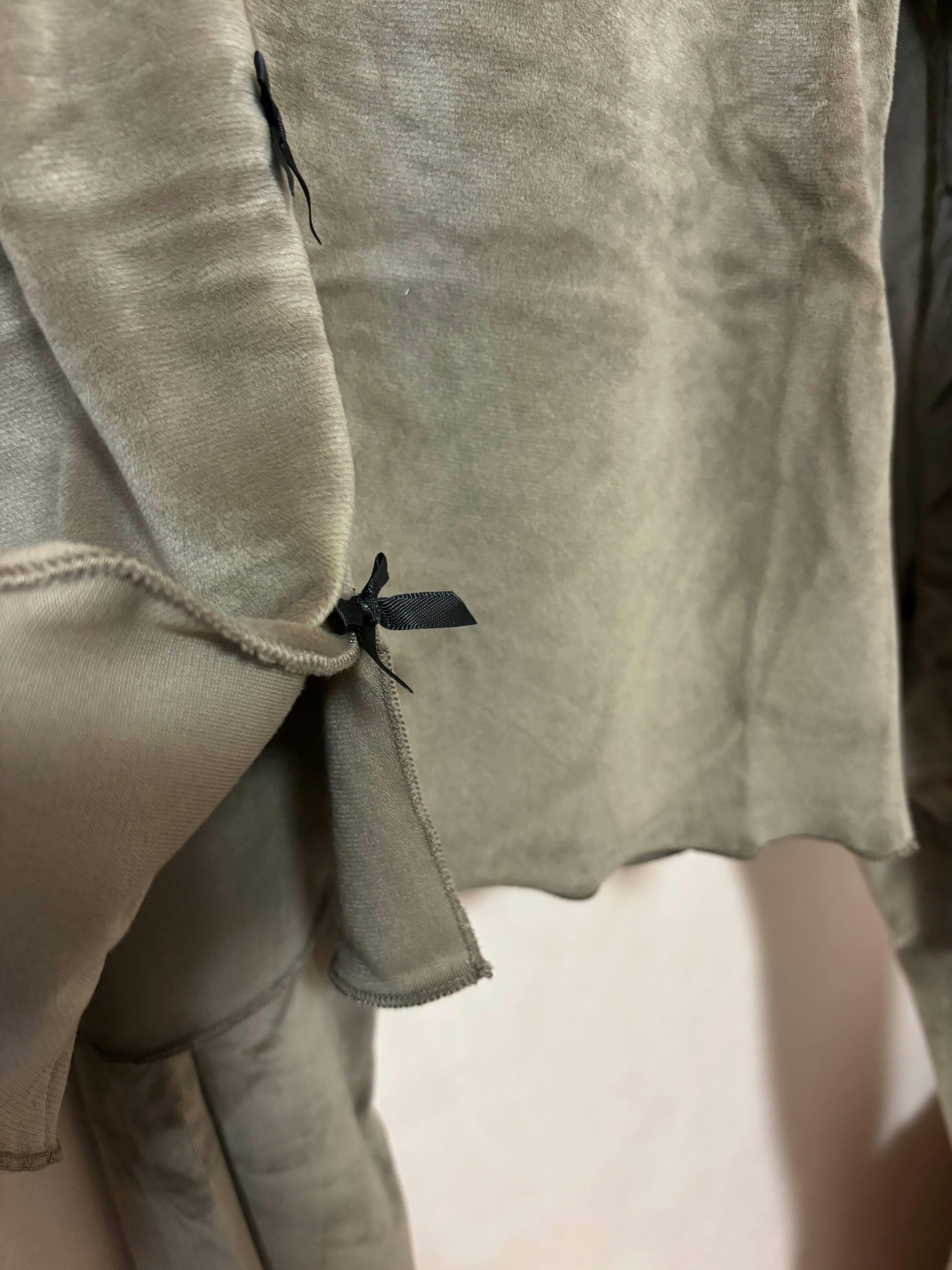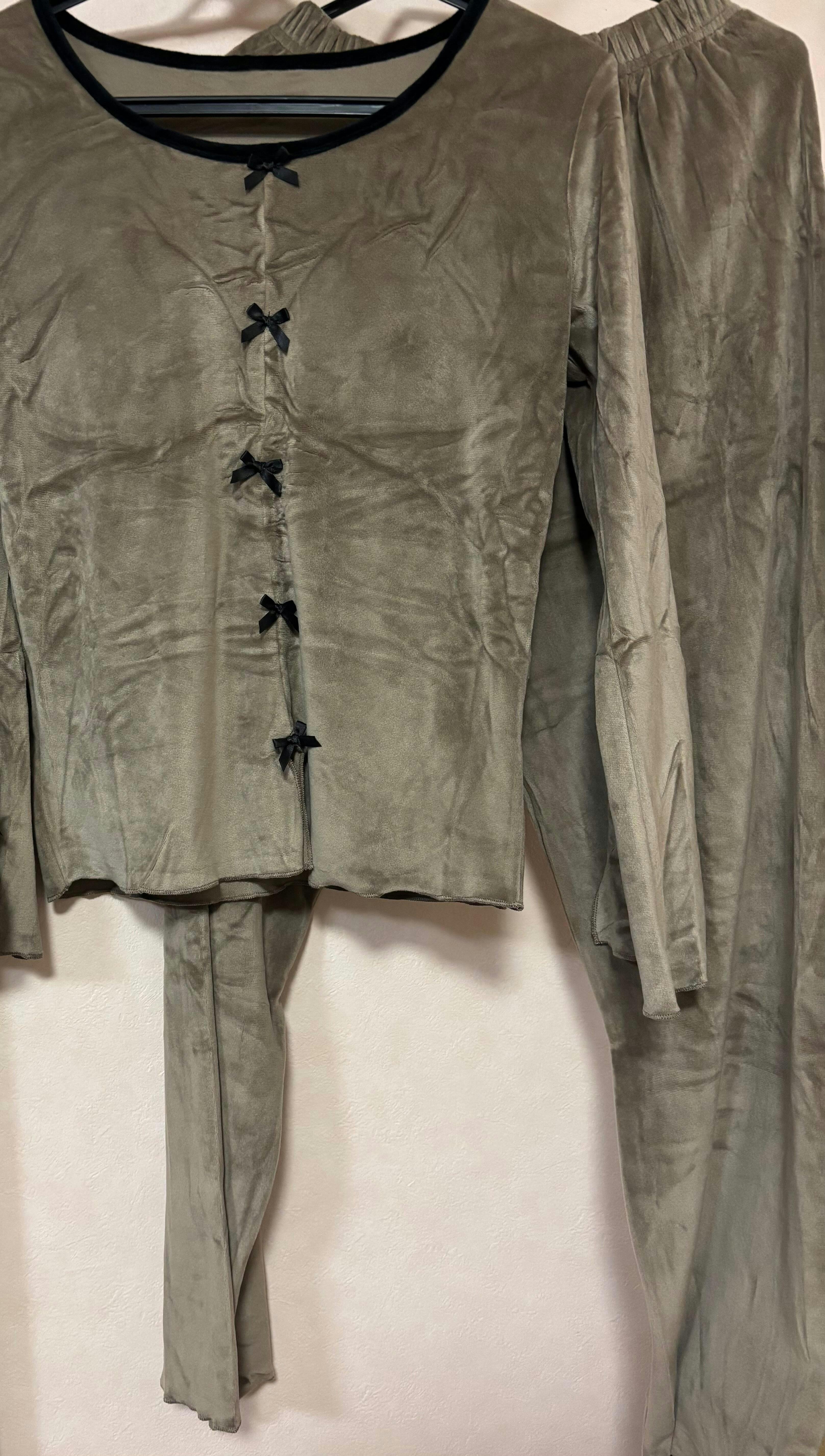 落ち着いたカラーにベロア調の艶感が加わり、大人っぽさと可愛さを両立。胸元から裾まで並ぶ小リボンが視線を集め、ルームウェアながら女性らしい存在感を引き出します。リラックスしていながらも「部屋着 男ウケ」を意識した華やかさが魅力です。