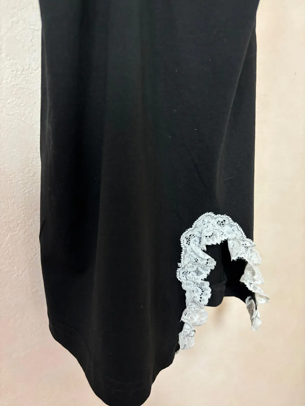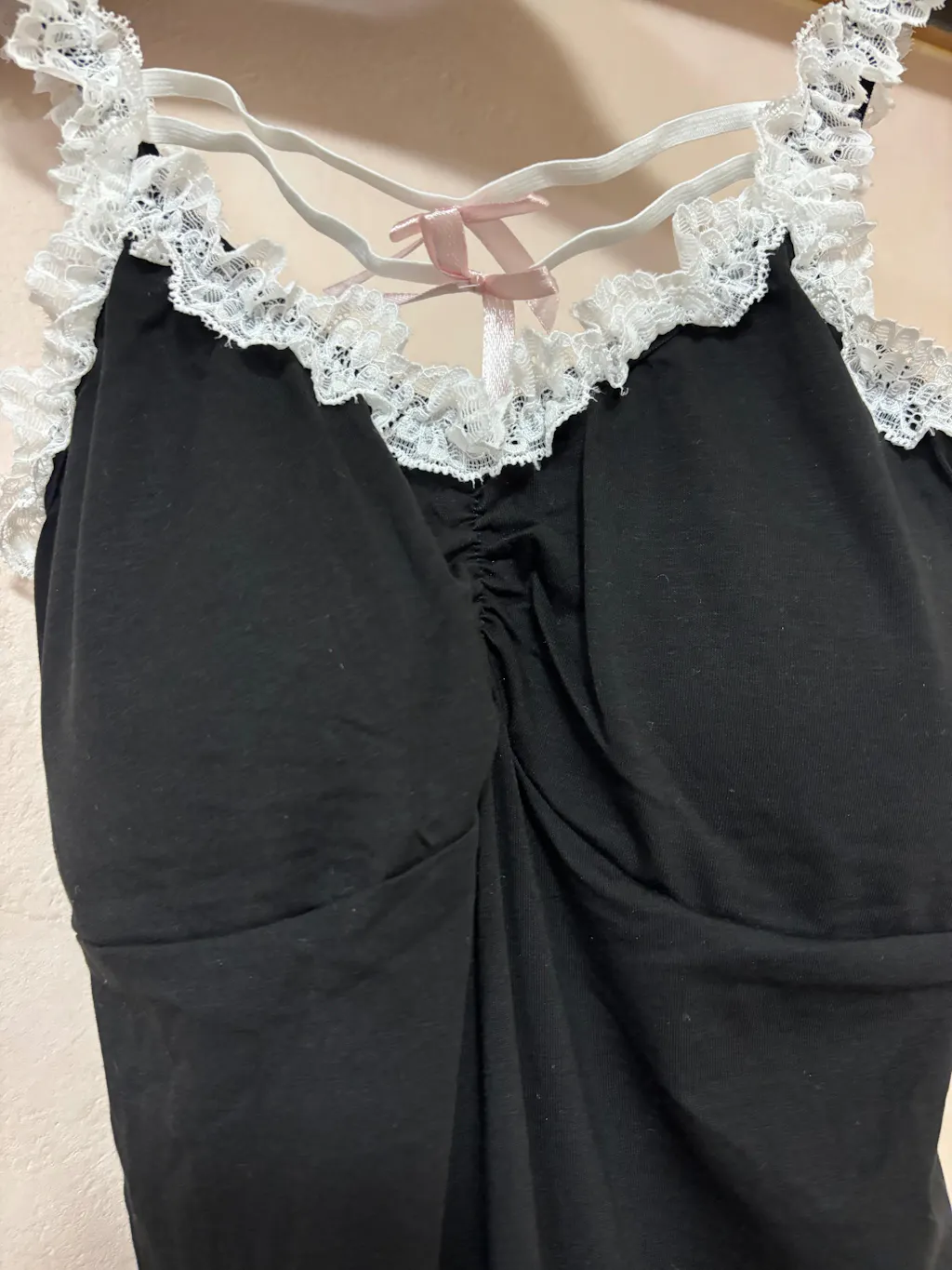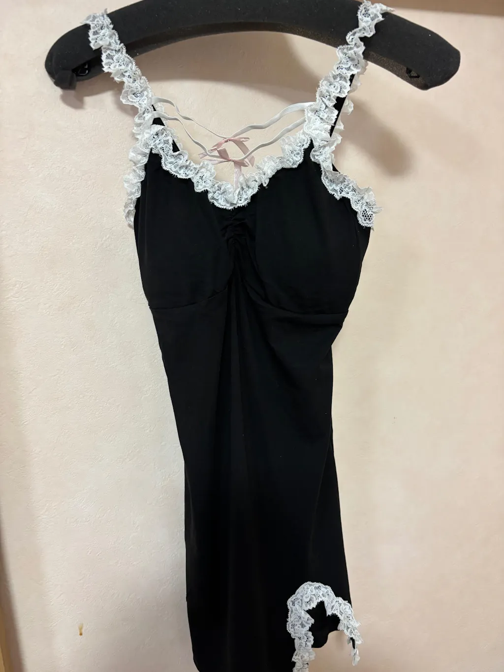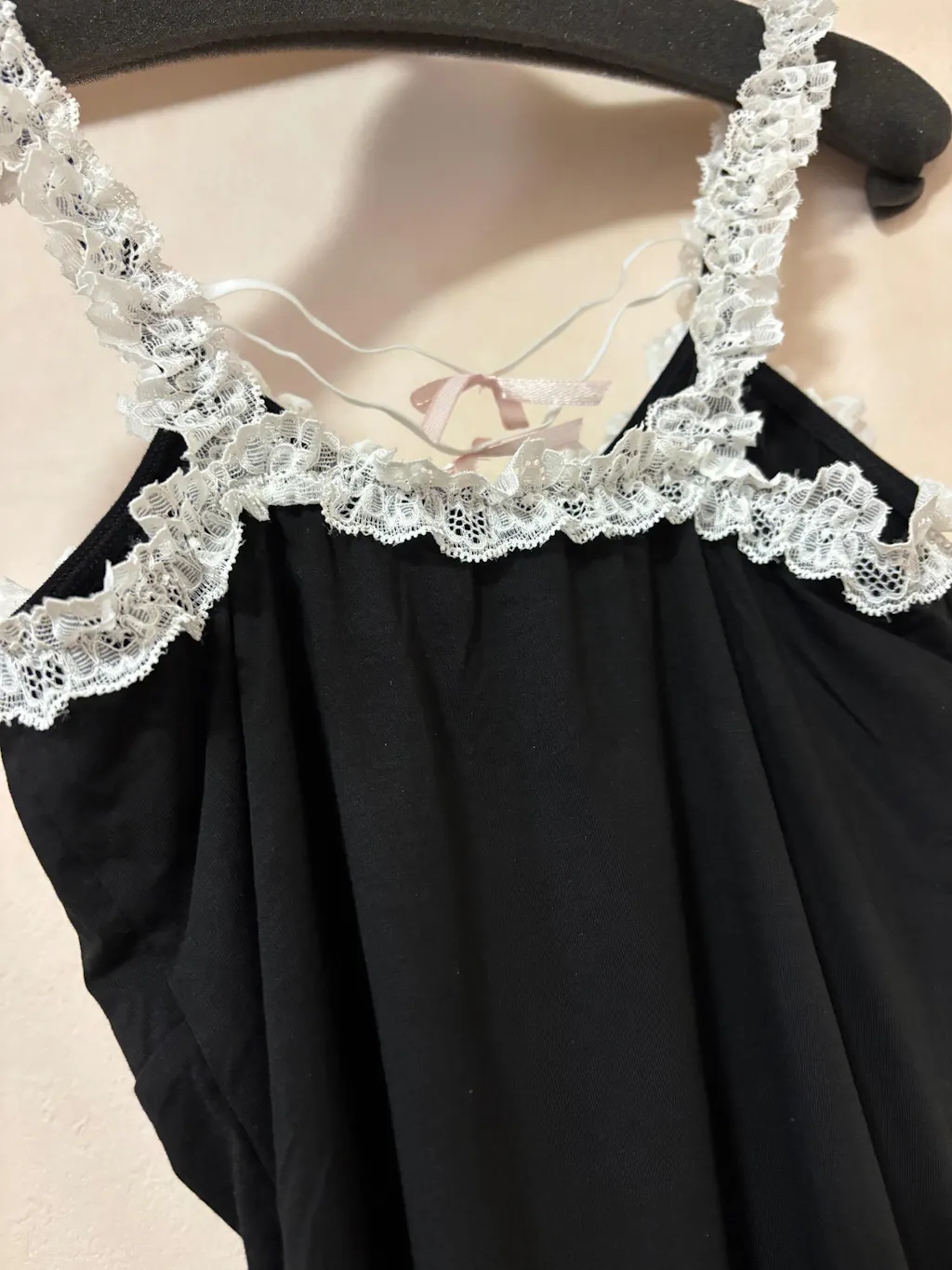 • 白レース切り替え: デコルテ・裾・ストラップにあしらわれたホワイトレースが、ブラックとのコントラストで視線を惹きつけるデザイン。