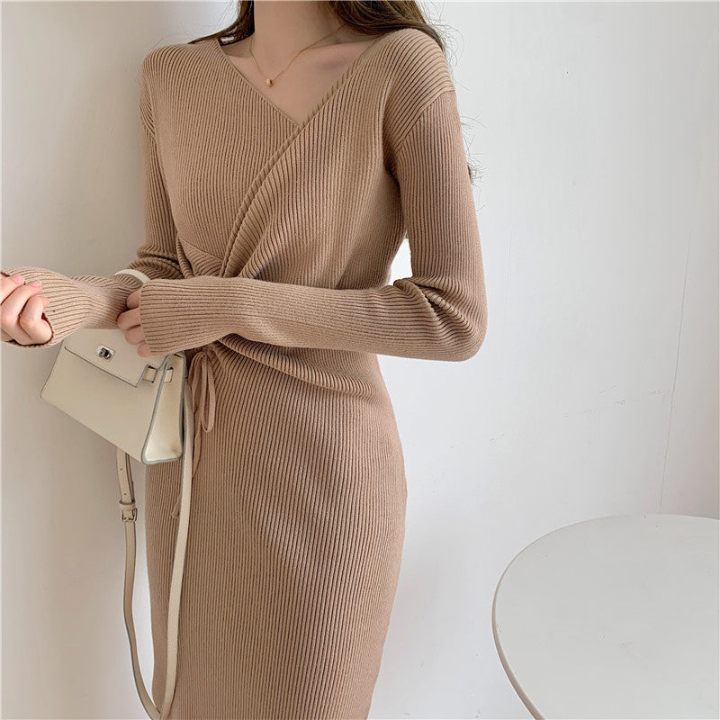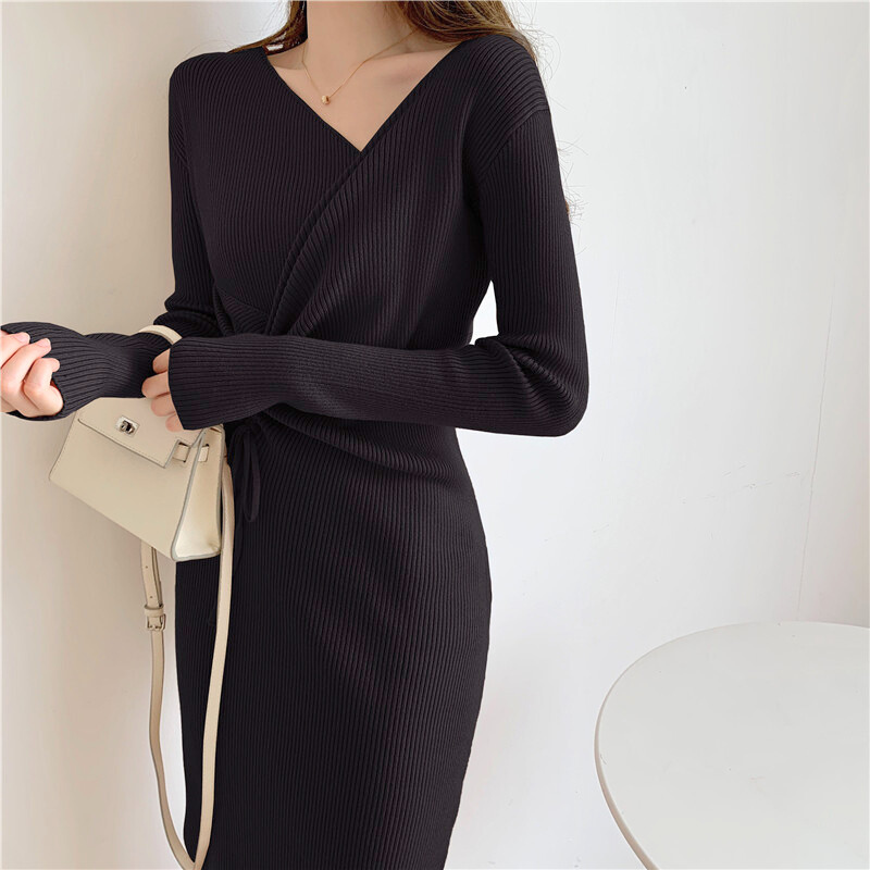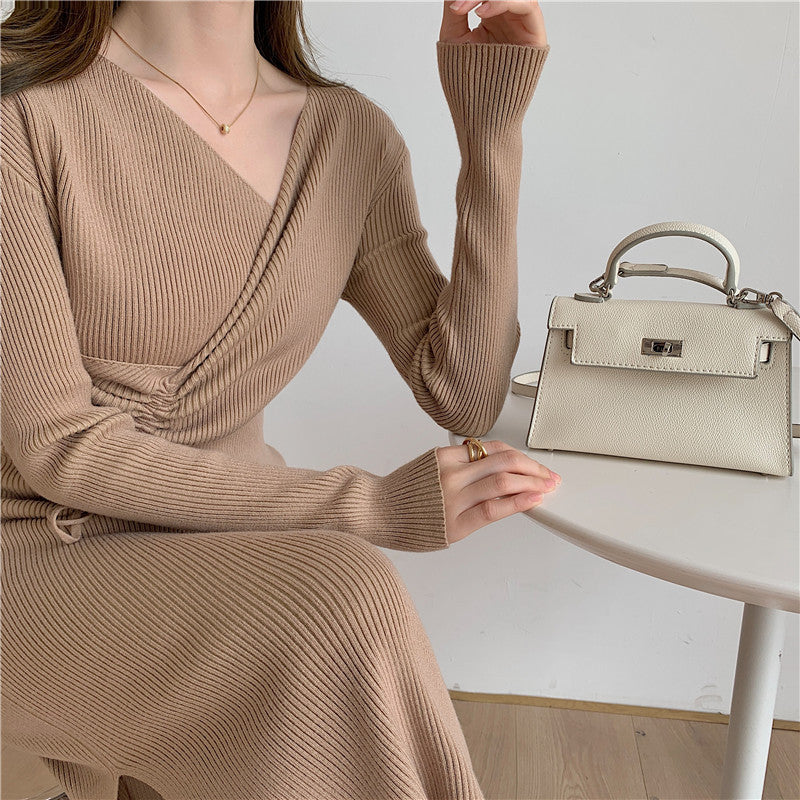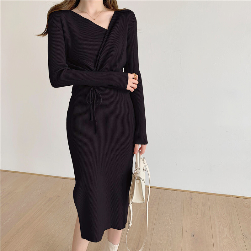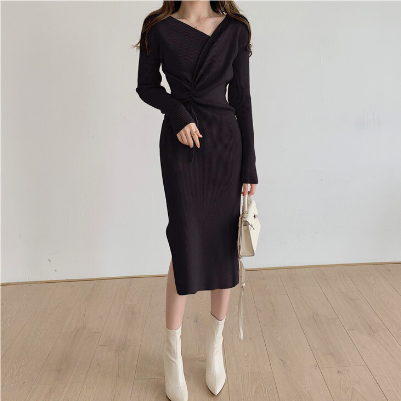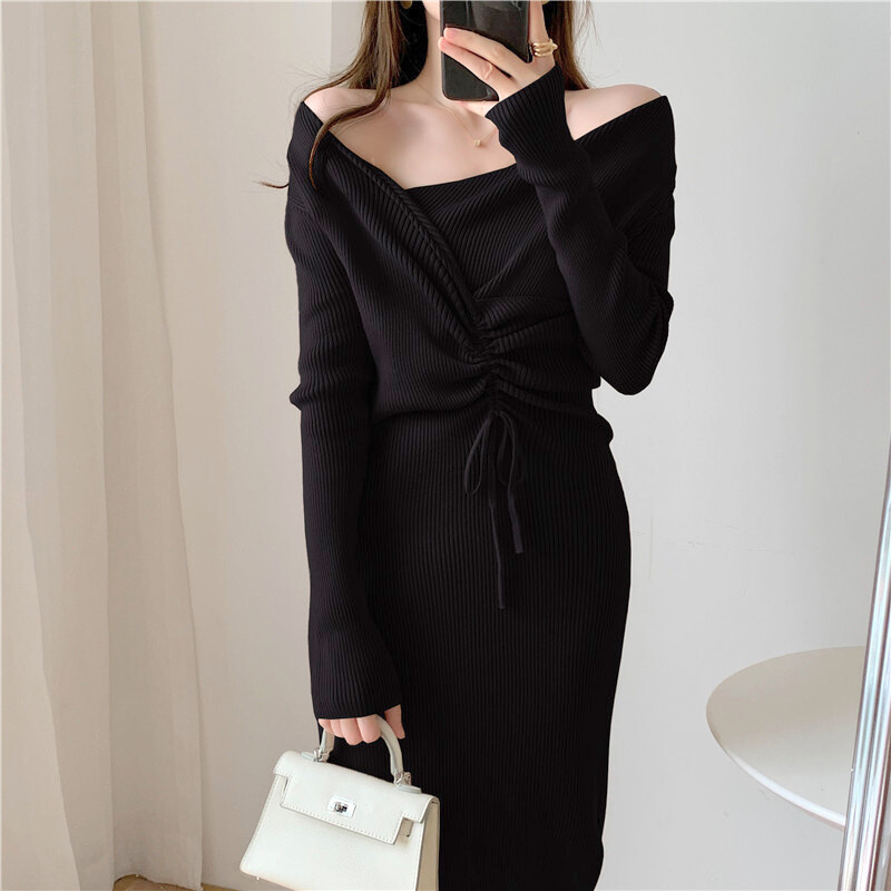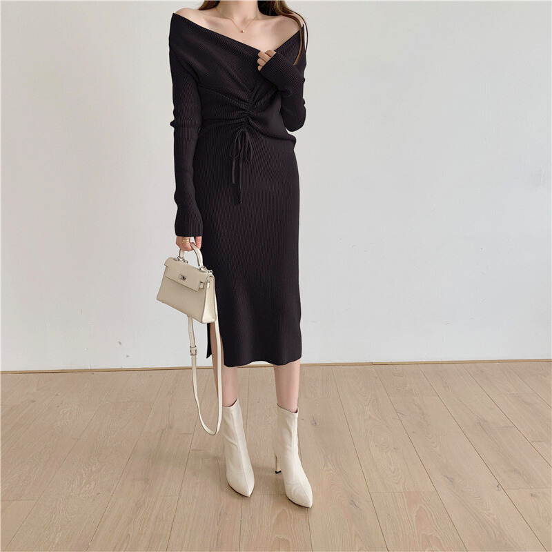 【ウエストギャザーが生み出す大人の色気】2wayオフショルダーニットワンピース