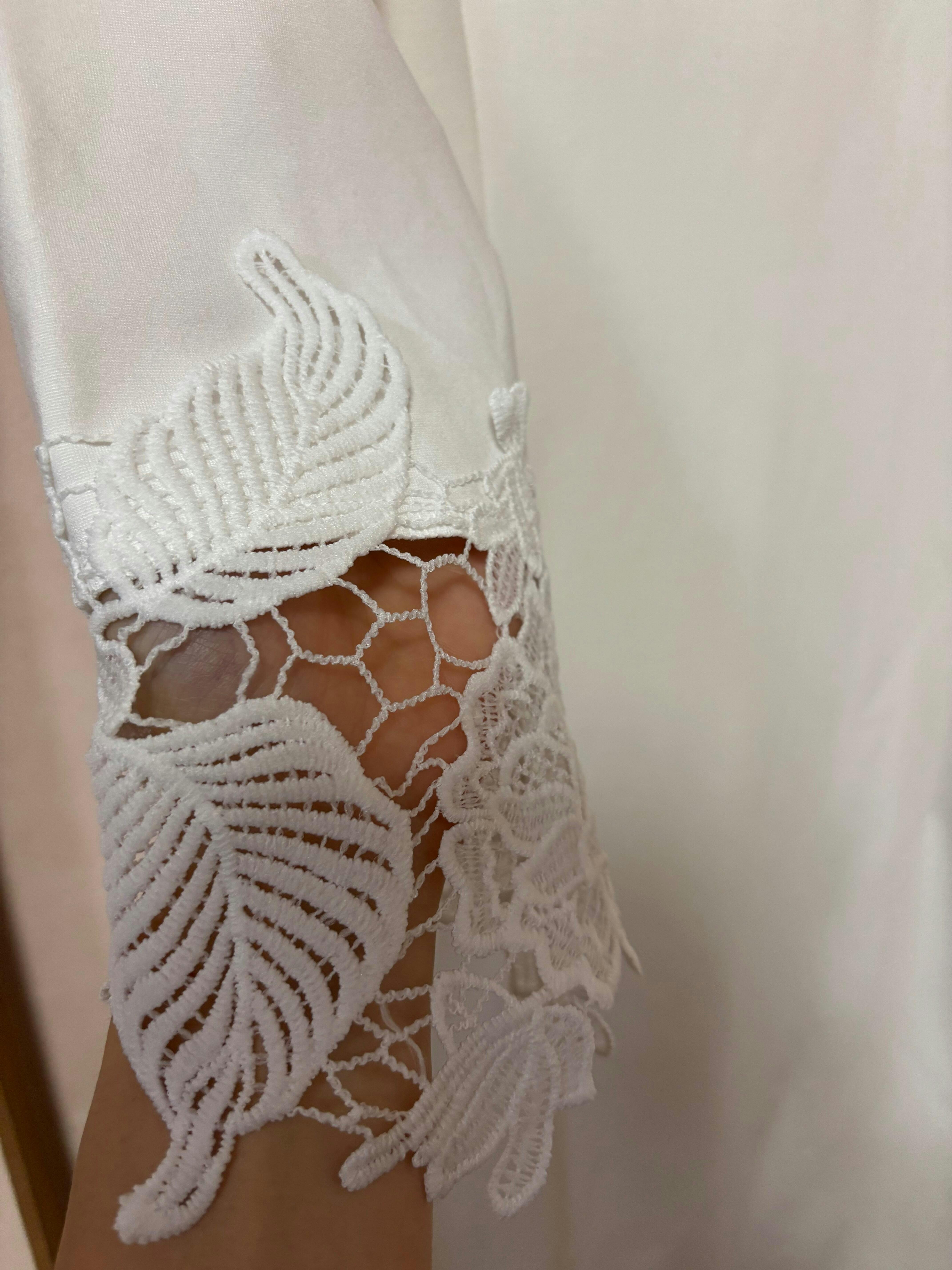 • レース袖の華やかさ: 7分袖に施された繊細なレースが、腕を華奢に見せつつフェミニンな印象をプラス。パーティーシーンにも映えるデザイン。
