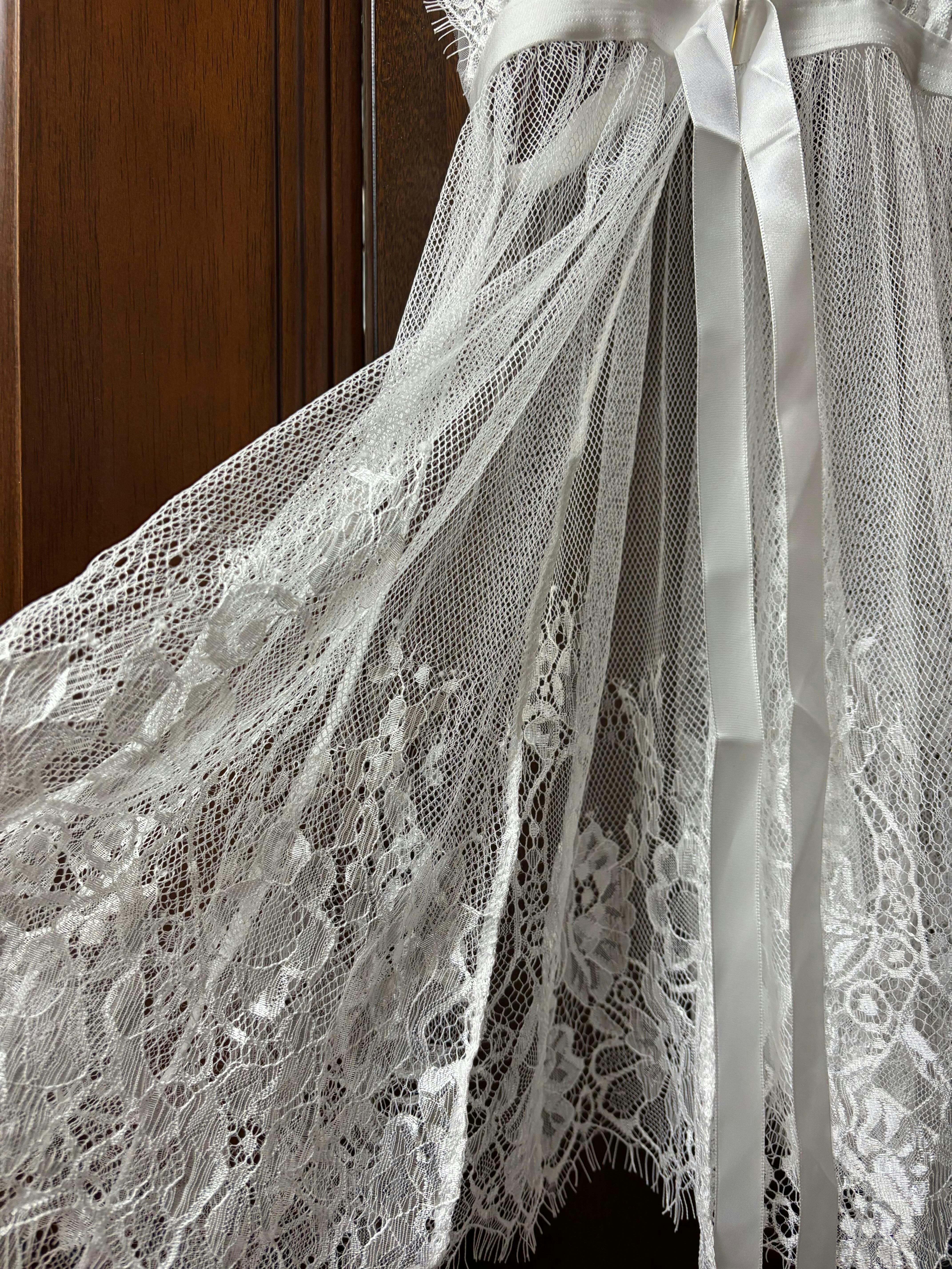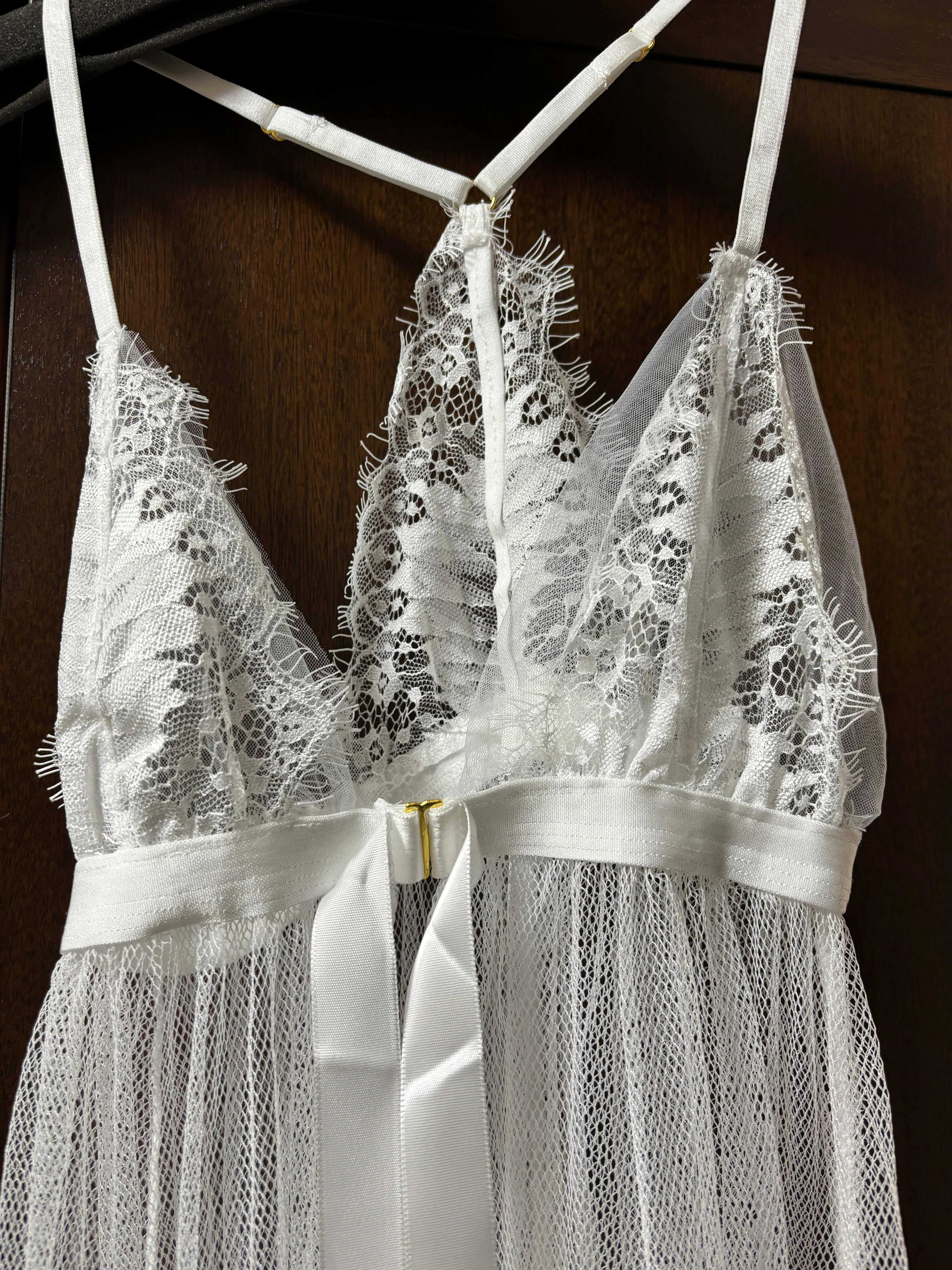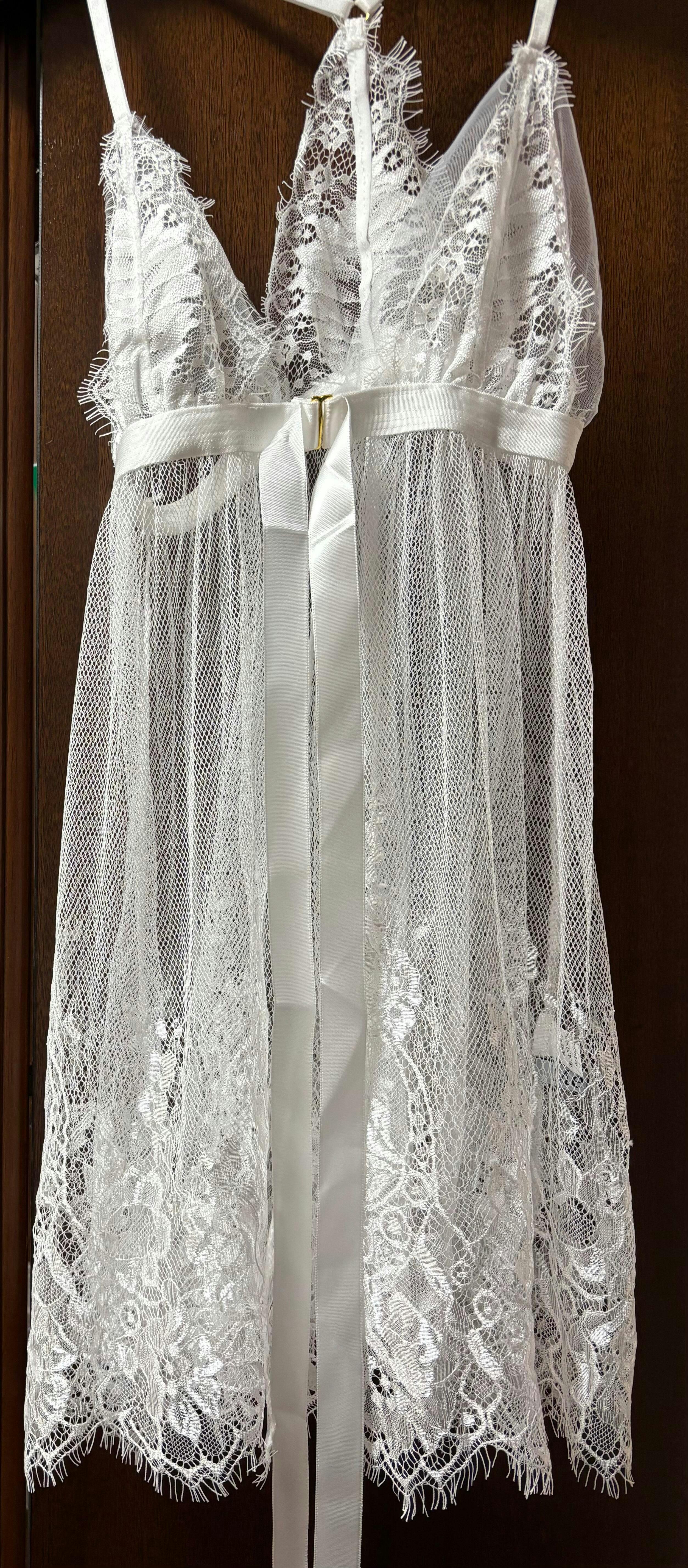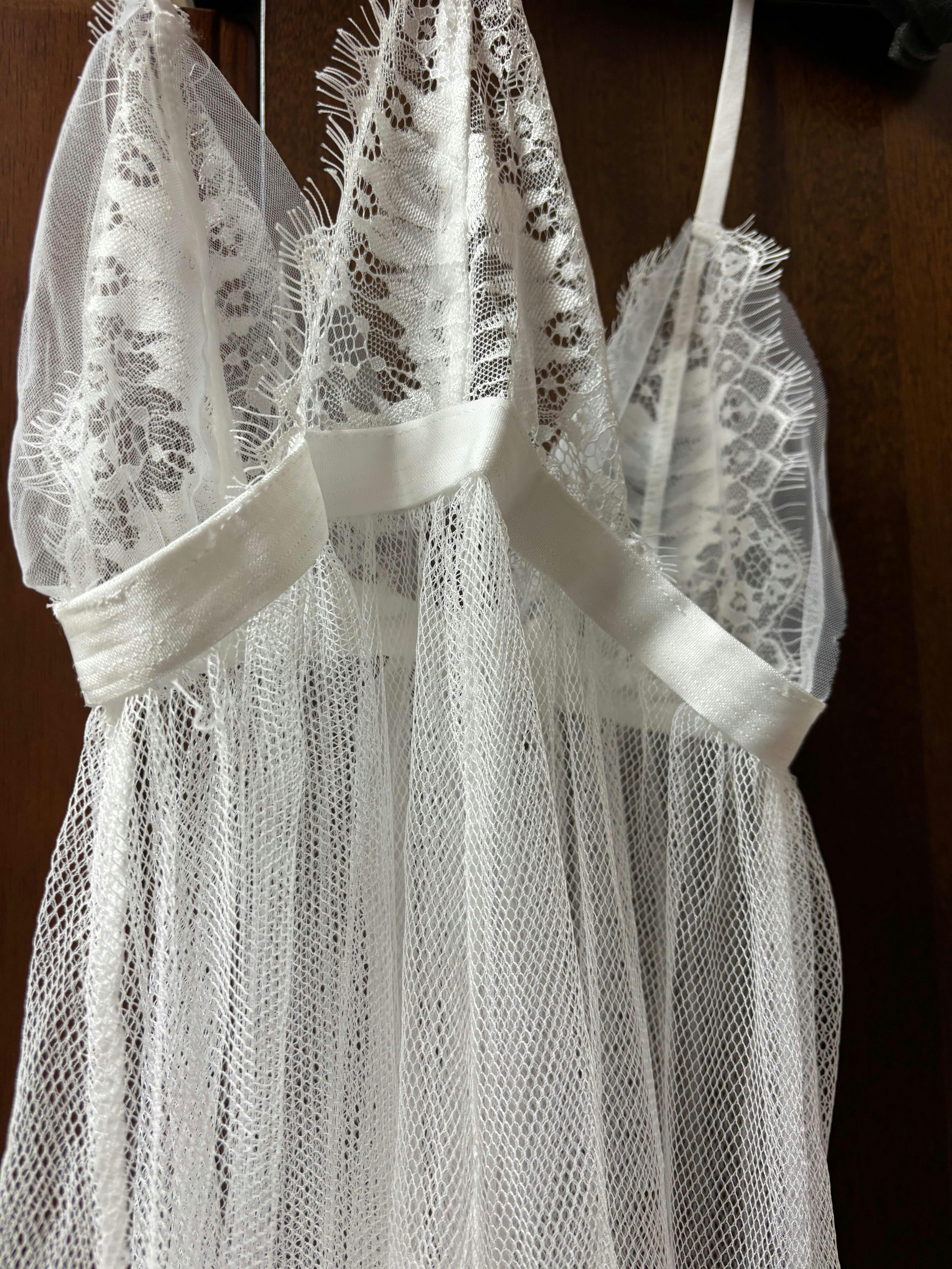 ふんわり広がるシアーレースがフェミニンな印象を与えながら、胸元の深いVラインが大人の色気を感じさせる一枚。程よく透ける素材が上品で、彼ウケ・旦那ウケどちらにもぴったりな仕上がり。おうちデートの夜や特別な時間を、よりドラマチックに彩ります。