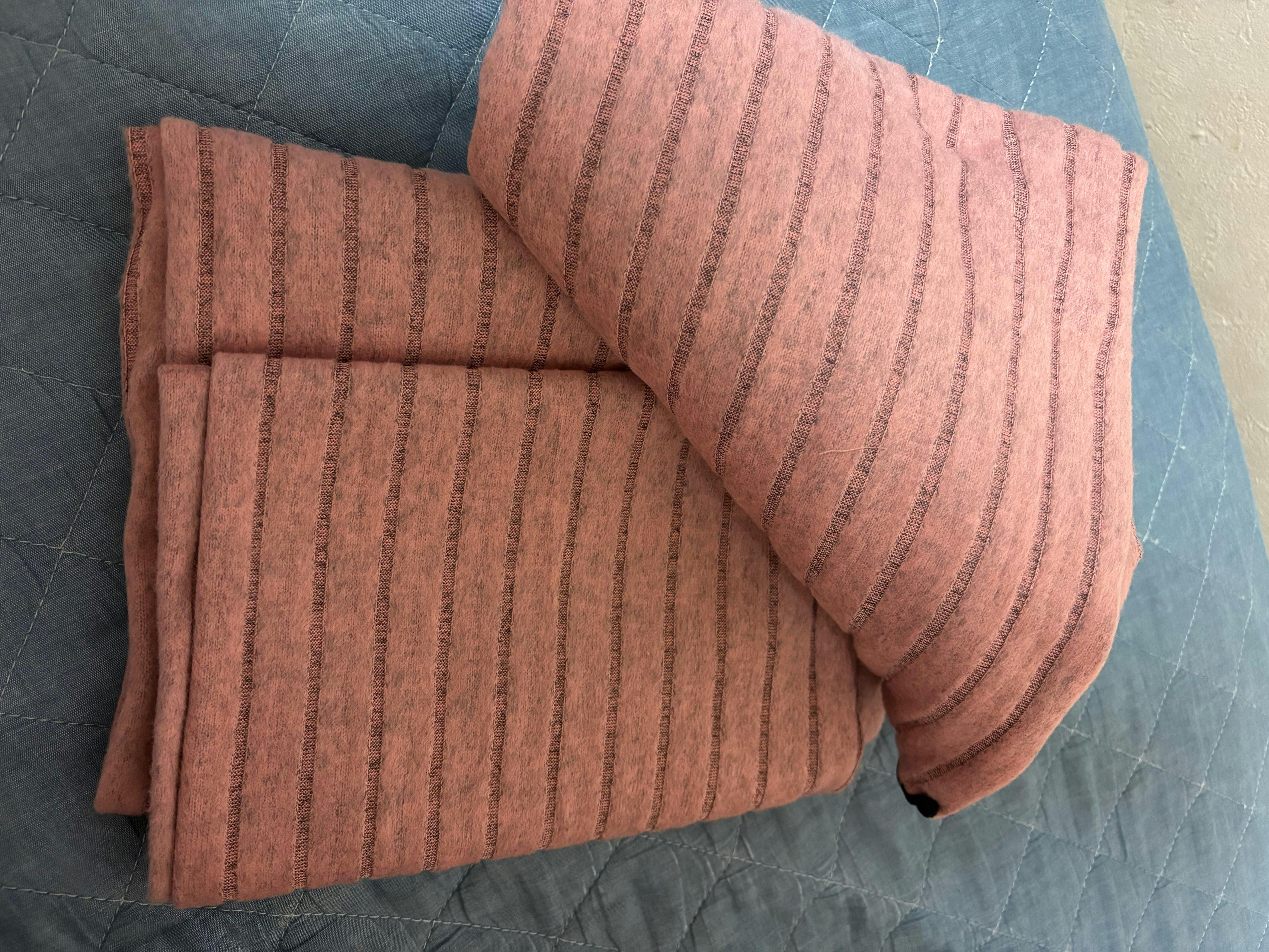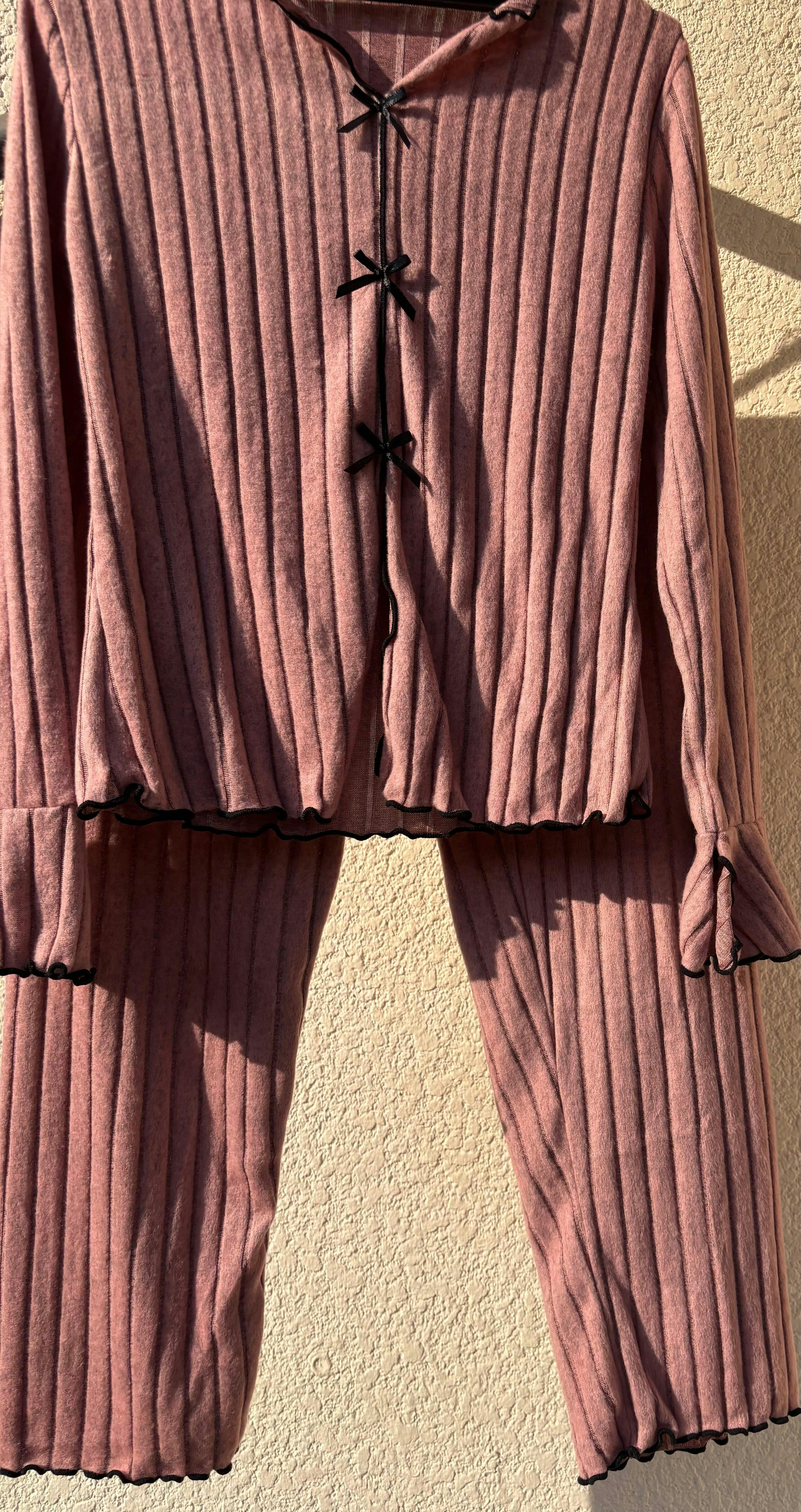 ピンク M / L 当日発送可【あったか裏起毛で冬でも可愛い】とろふわ裏起毛リブニット風ルームウェア上下セット 長袖トップス×ロングパンツ