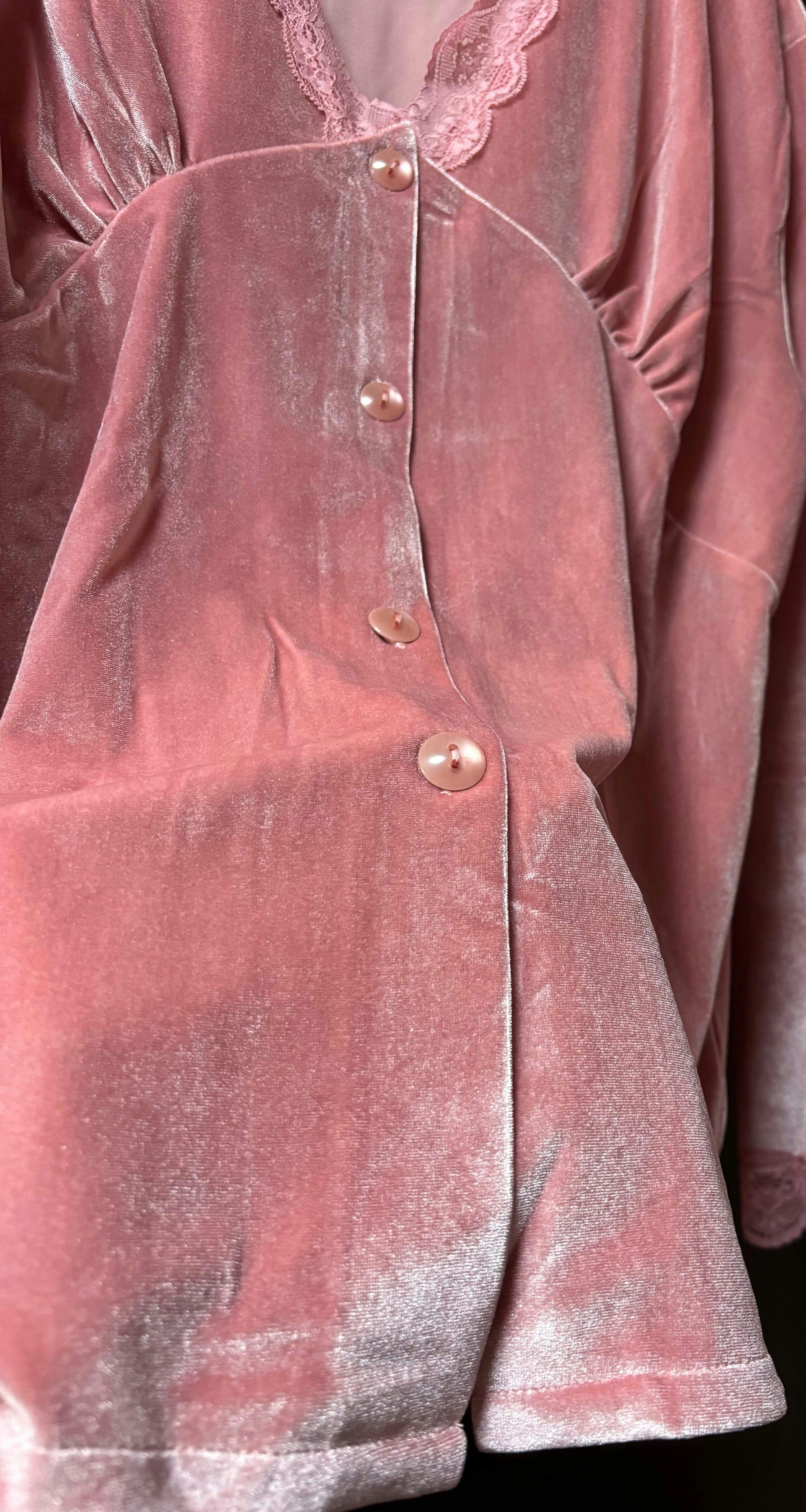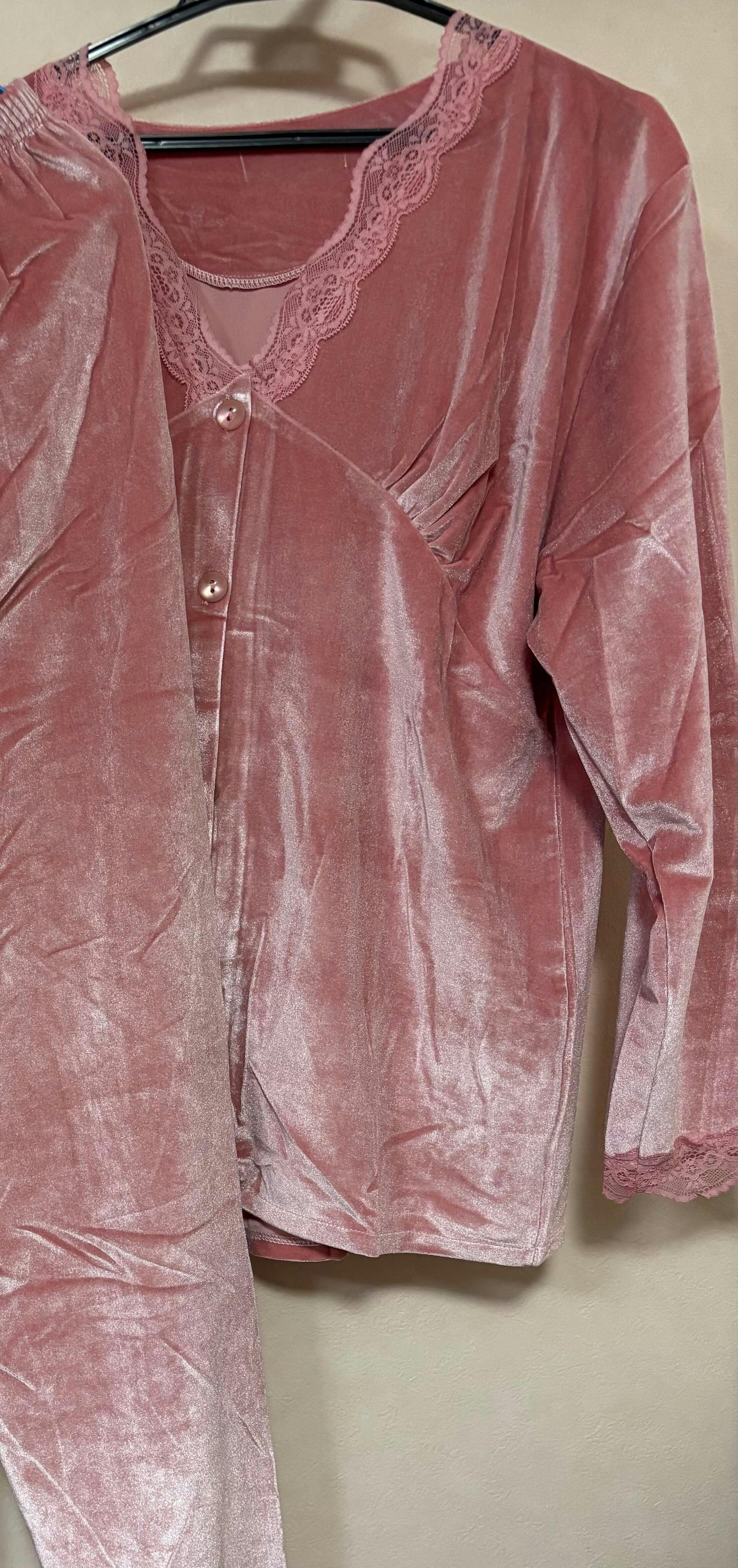 ピンクM 当日発送可【肌ざわり抜群♡色っぽベロア】レースVネックベロアルームウェア上下セット