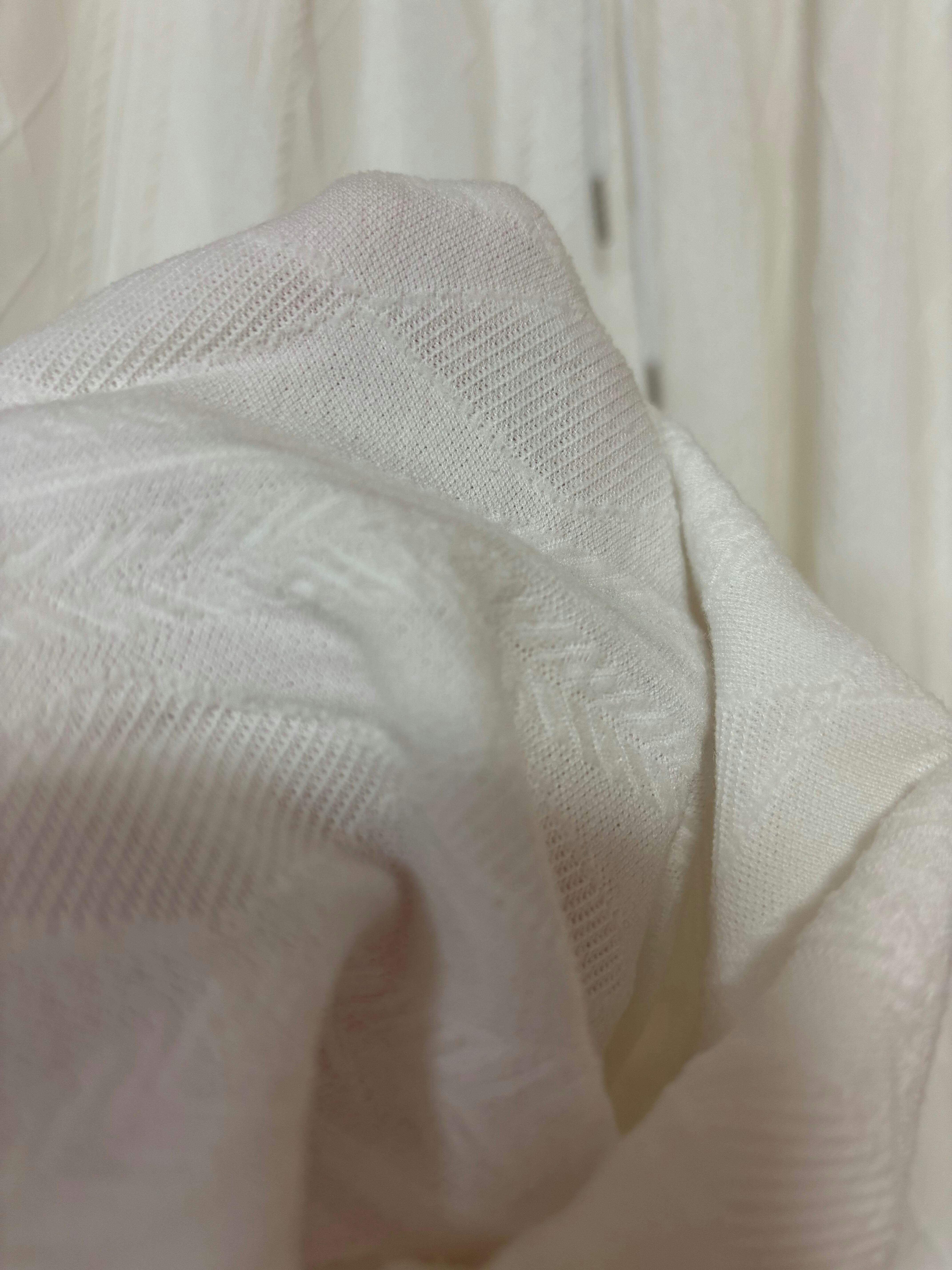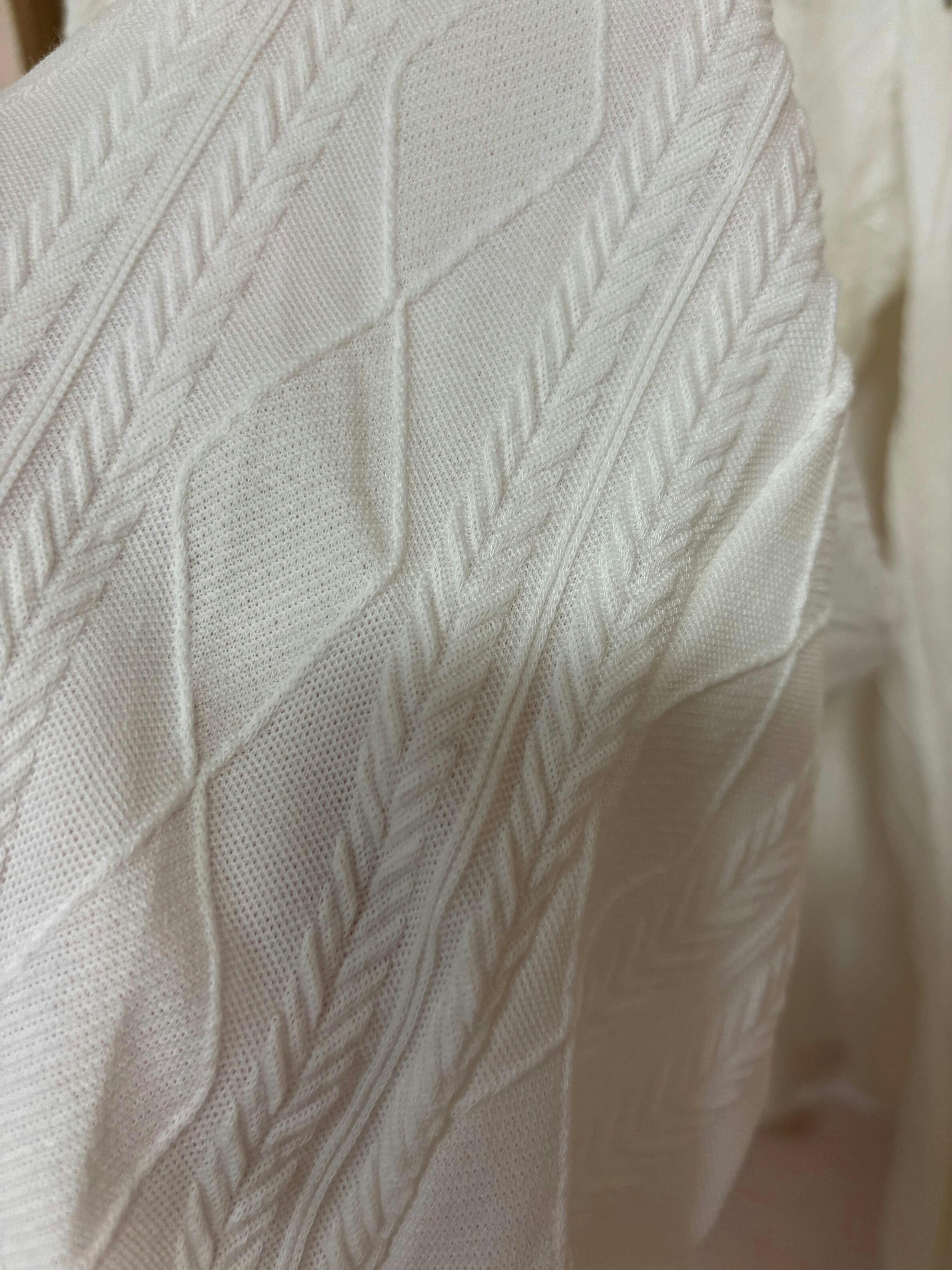 • 綿混紡サマーニット素材: 軽やかで肌離れの良い綿混サマーニット。凹凸のあるケーブル編み調デザインが、立体感と高級感を演出します。
