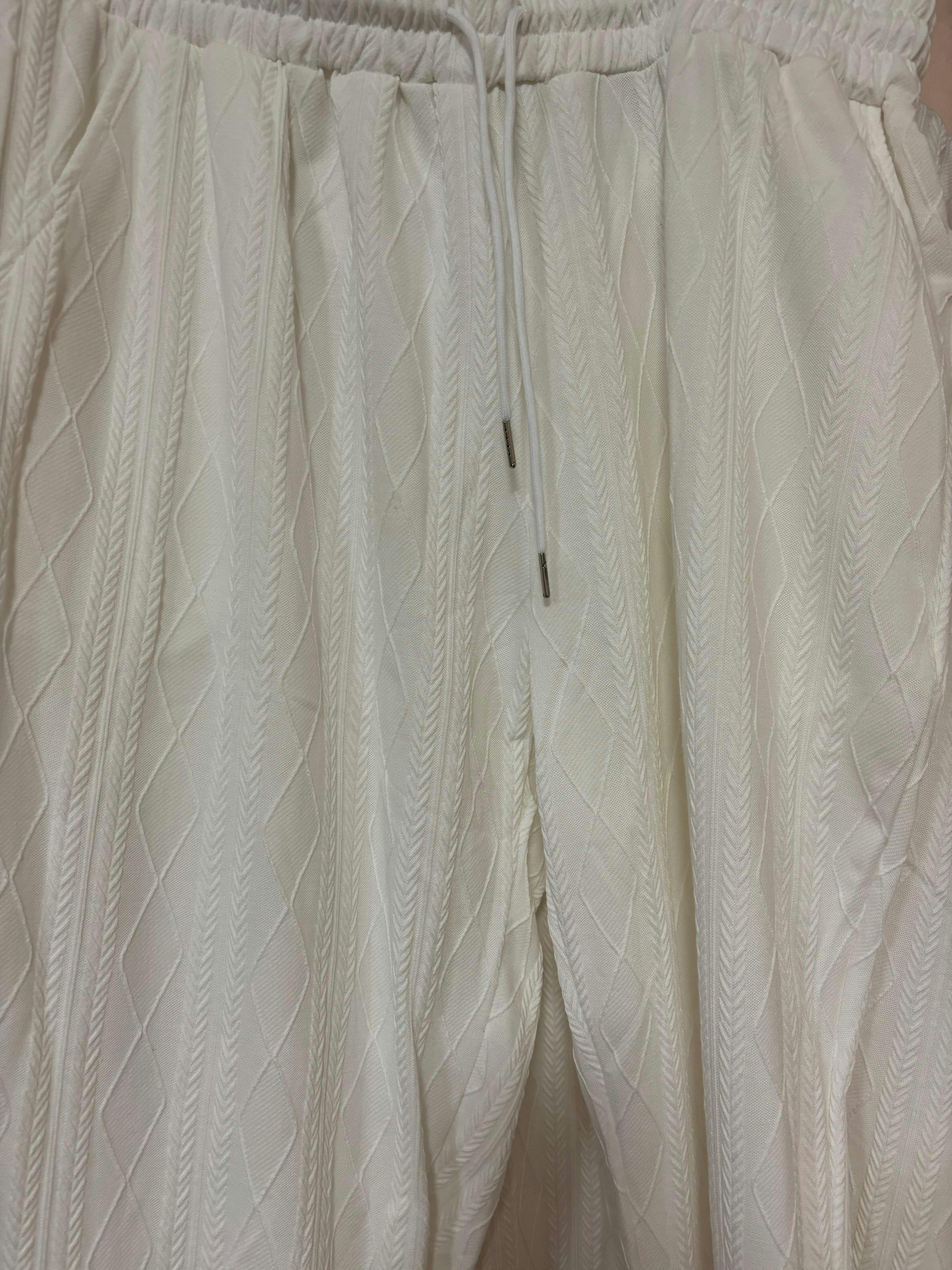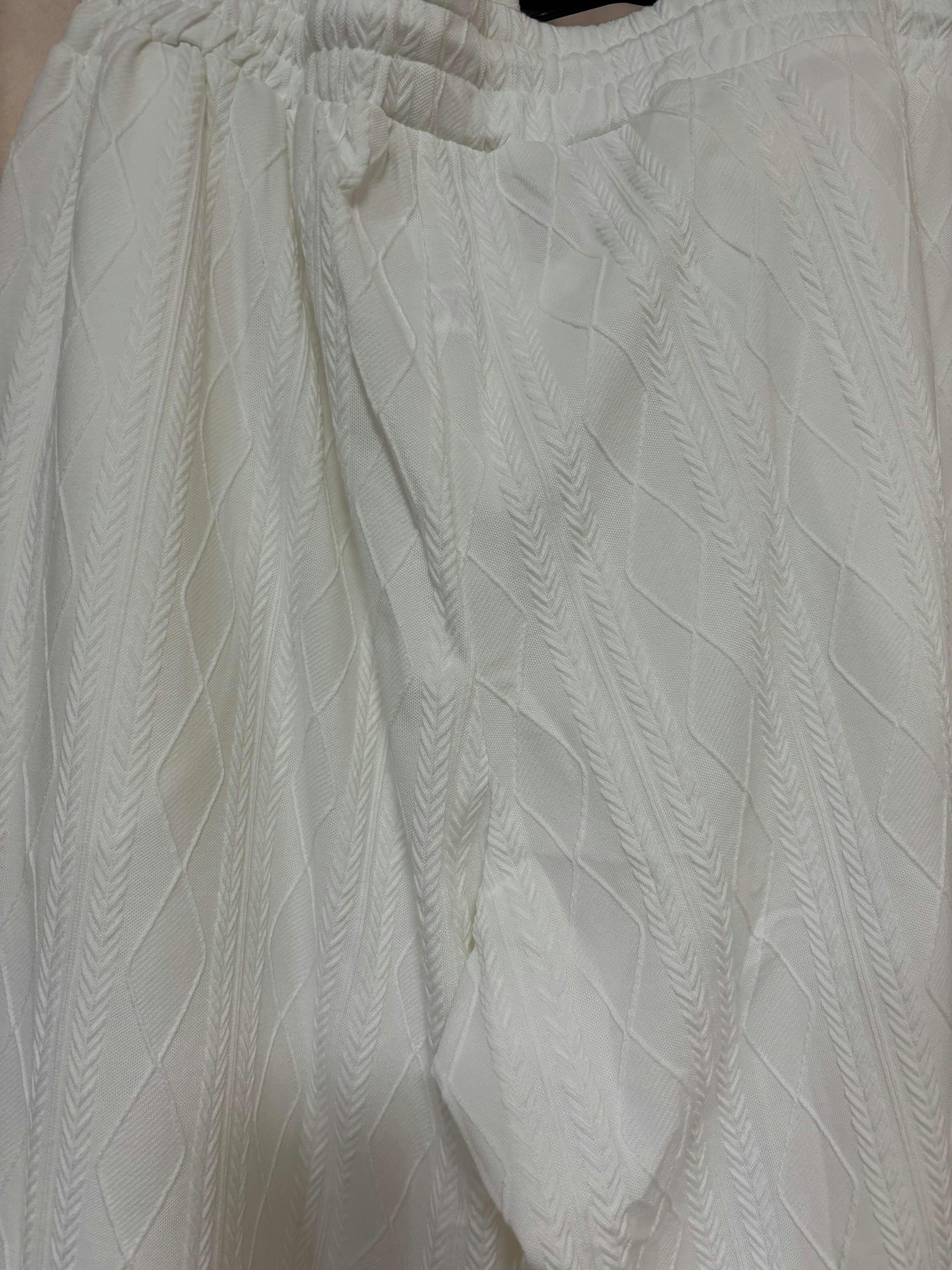 • フルレングスのロングパンツ: 脚長効果のあるストレートシルエット。薄手で通気性がよく、真夏でも快適に過ごせる一着です。