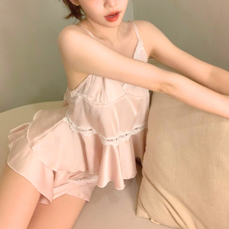 サテンレースティアードルームウェア キャミ×ショートパンツ(胸パッド付き)