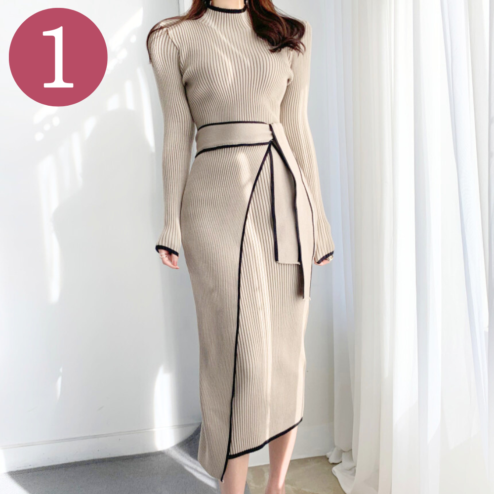 【品のある配色×ラップデザイン】バイカラーリブニットワンピース