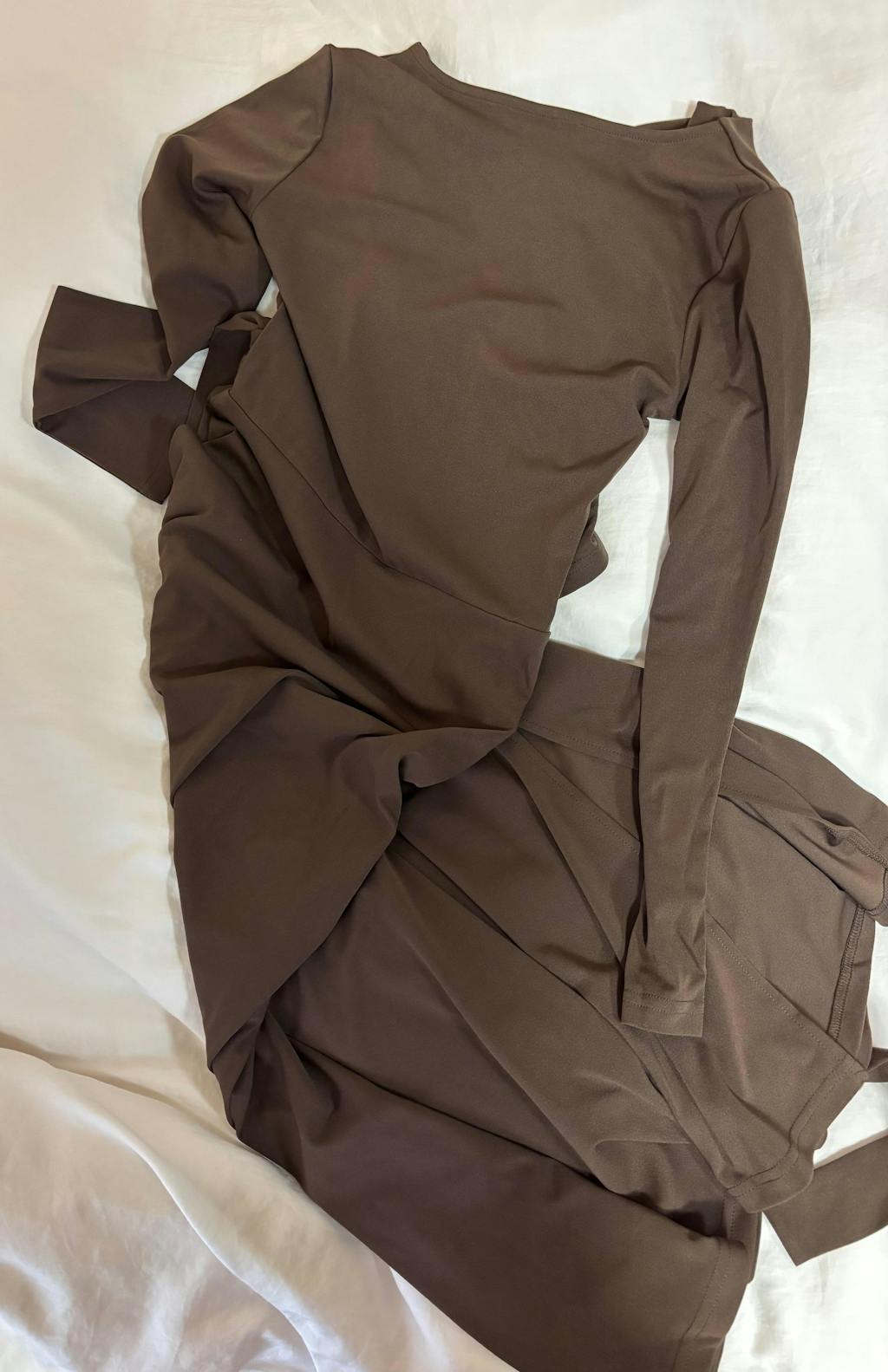 「カシュクールでウエストラインを強調できるうえに、スリットから見える脚のラインもセクシーですね!リボンを外したらどうなるんだろうと、思わず想像を膨らませてしまいます。」