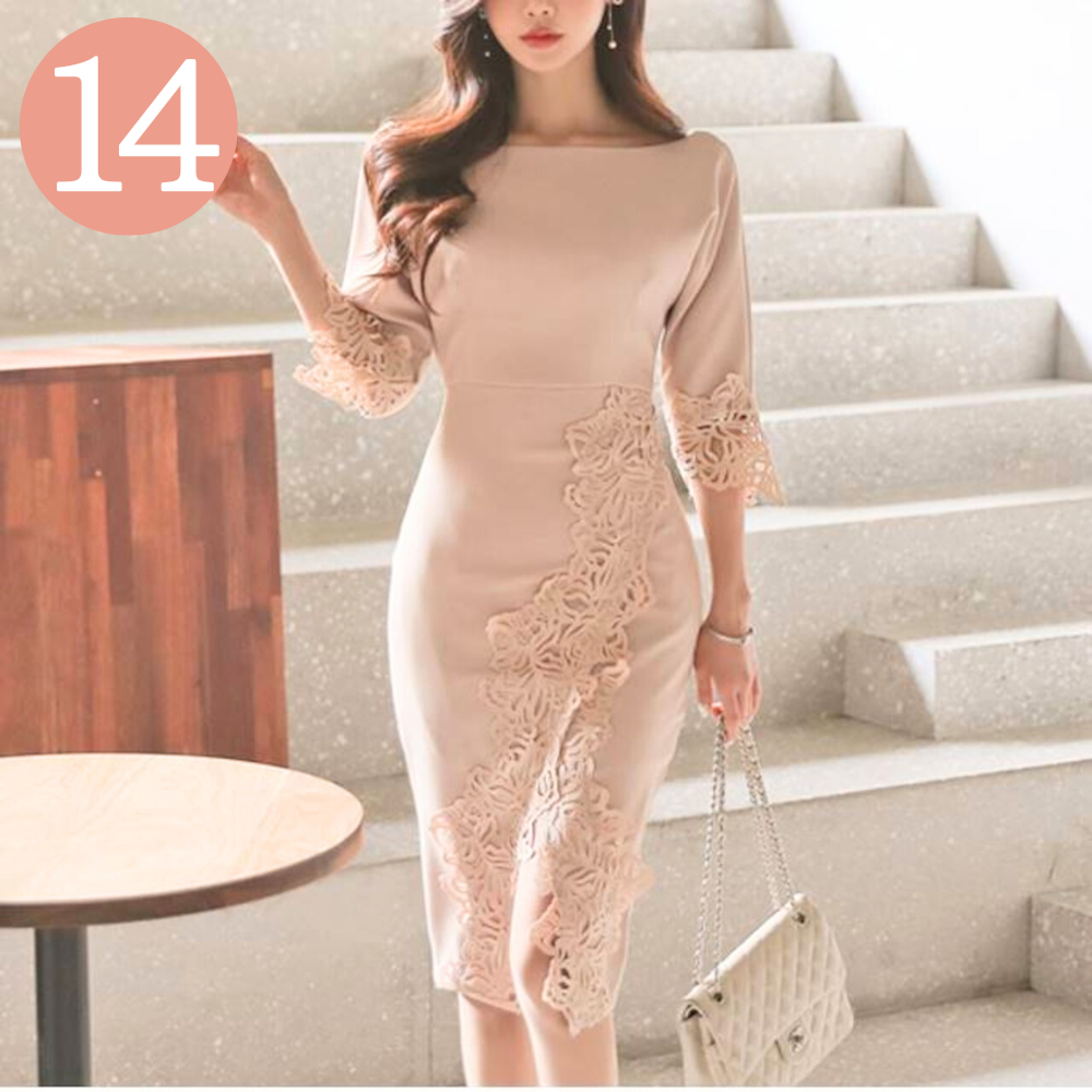 【さりげない肌見せが媚びない色気を】ピンクベージュレーススリット入りボートネックタイトワンピース