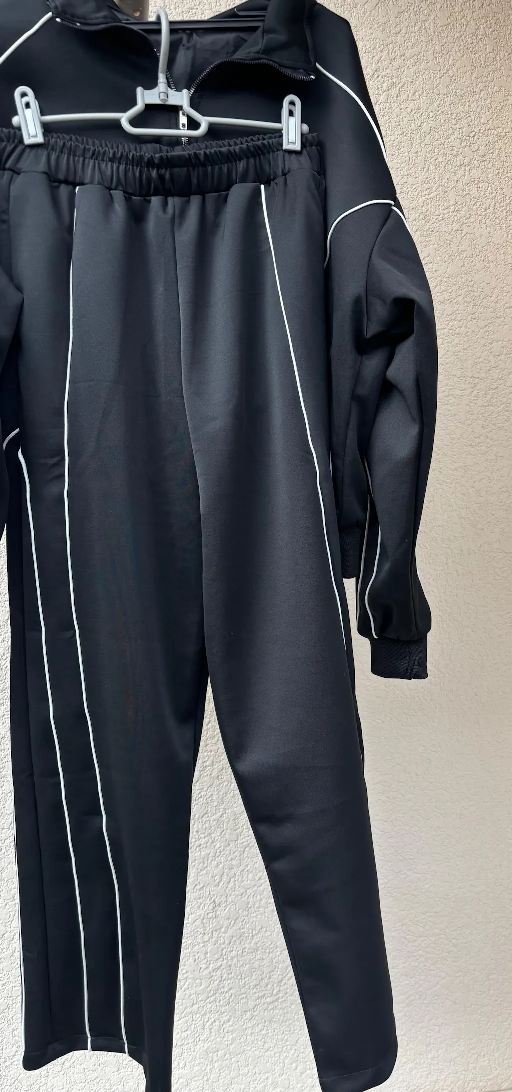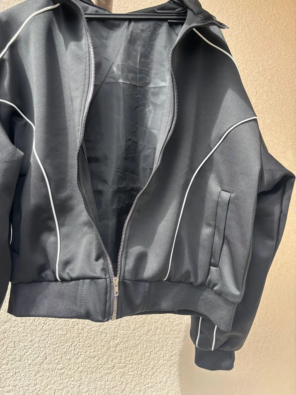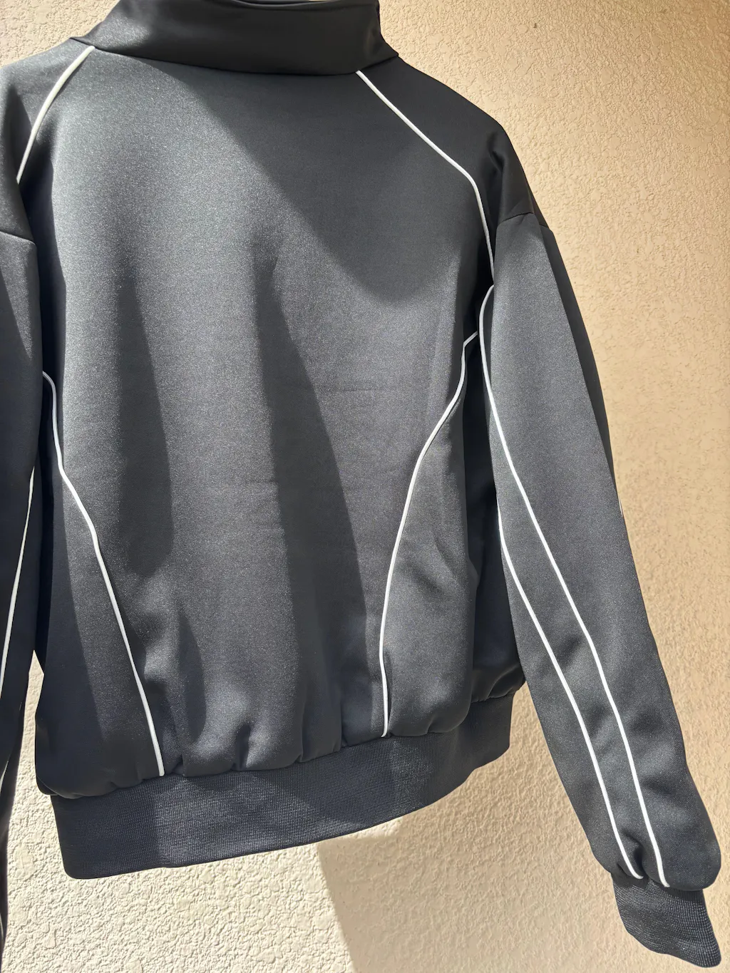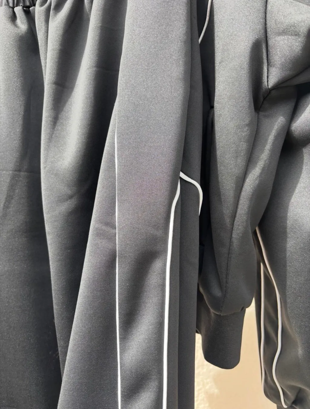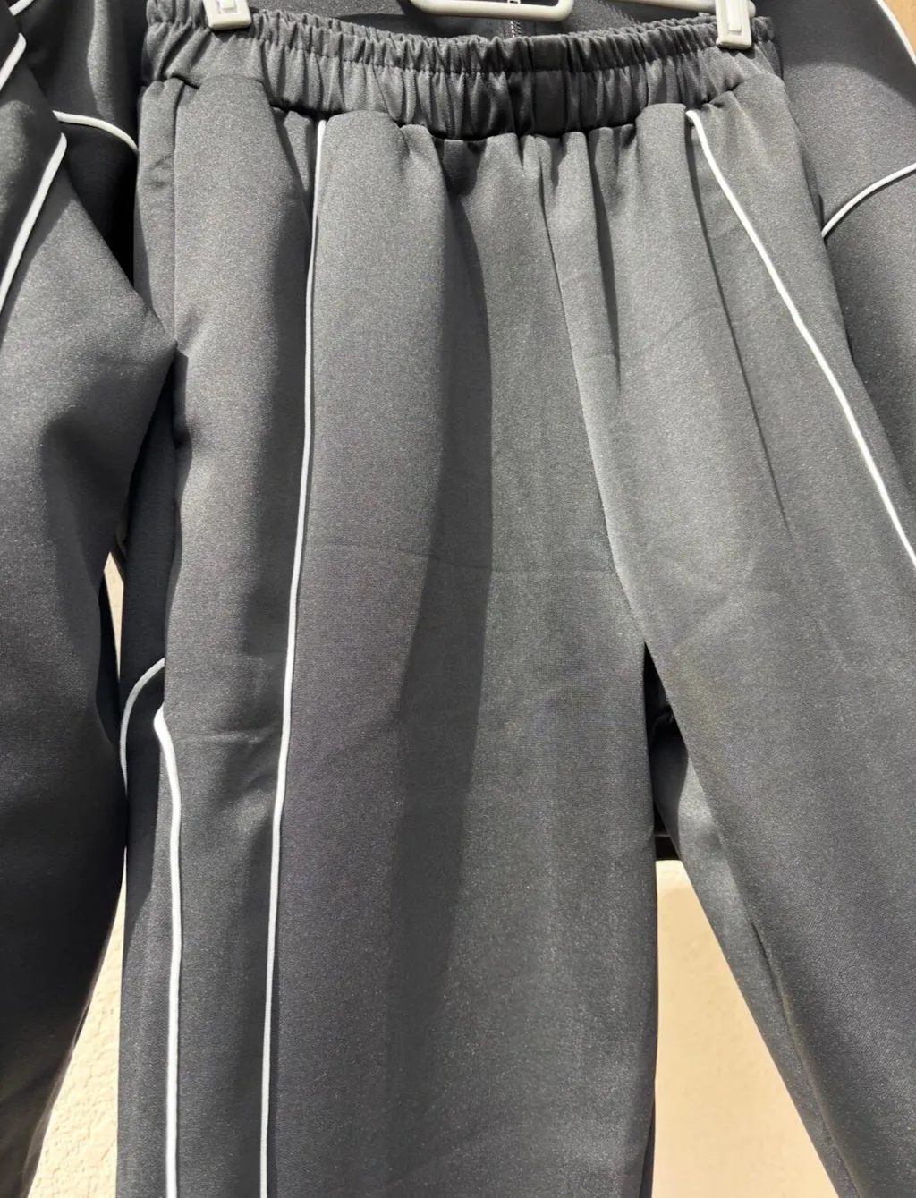 • 配色ラインのアクセント:ジップアップジャケット×ストレートパンツの上下ともに、袖と脚に走る配色パイピングがアクセントになったモード感ある切り替えデザイン。