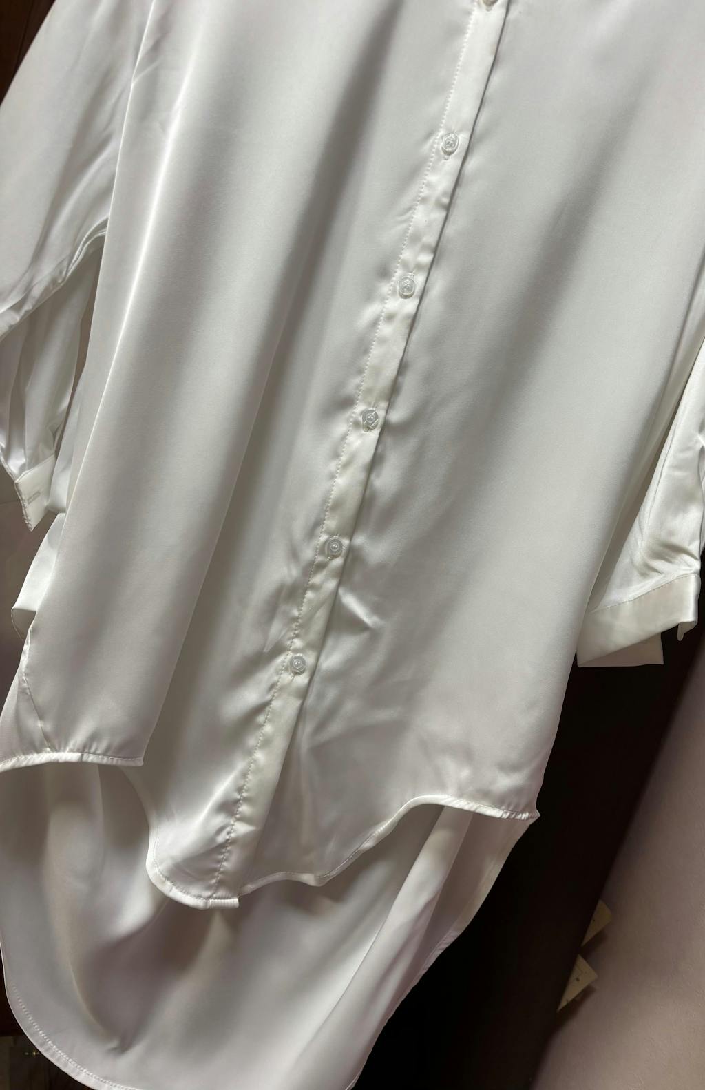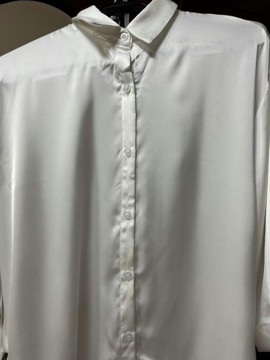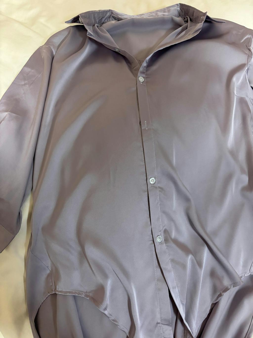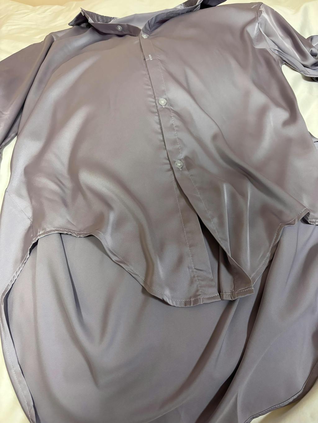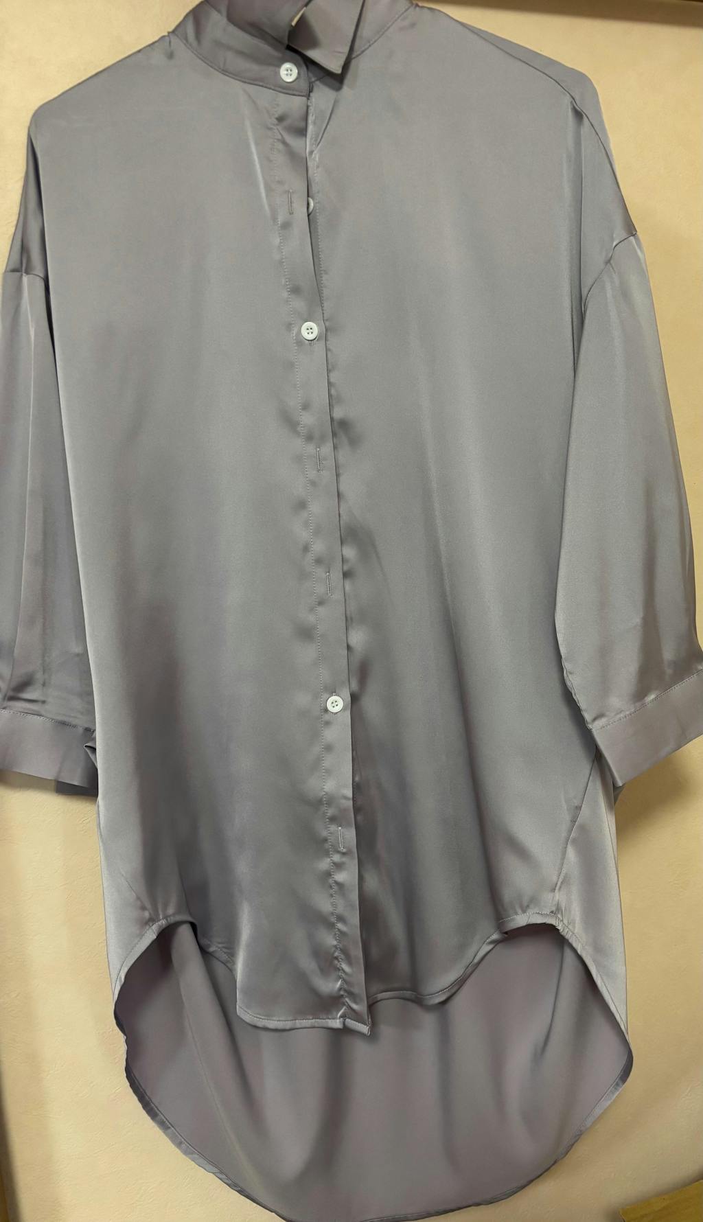 シルクのような光沢とオーバーサイズの絶妙なゆるさが、大人可愛い雰囲気を演出。 露出は控えめなのに、上品なセクシーさが男ウケを自然に引き寄せます。 動くたびに生まれるドレープがエレガントで、特別な夜にも普段使いにも対応可能です。